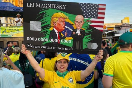Cartazes exibidos na manifestação reforçavam críticas ao STF e a solidariedade com o ex-presidente Jair Bolsonaro (PL), alvo de perseguições judiciais. Um deles dizia: “Lei Magnitsky. Moraes cartão nunca mais”, em referência a sanções internacionais contra abusos de ministros.