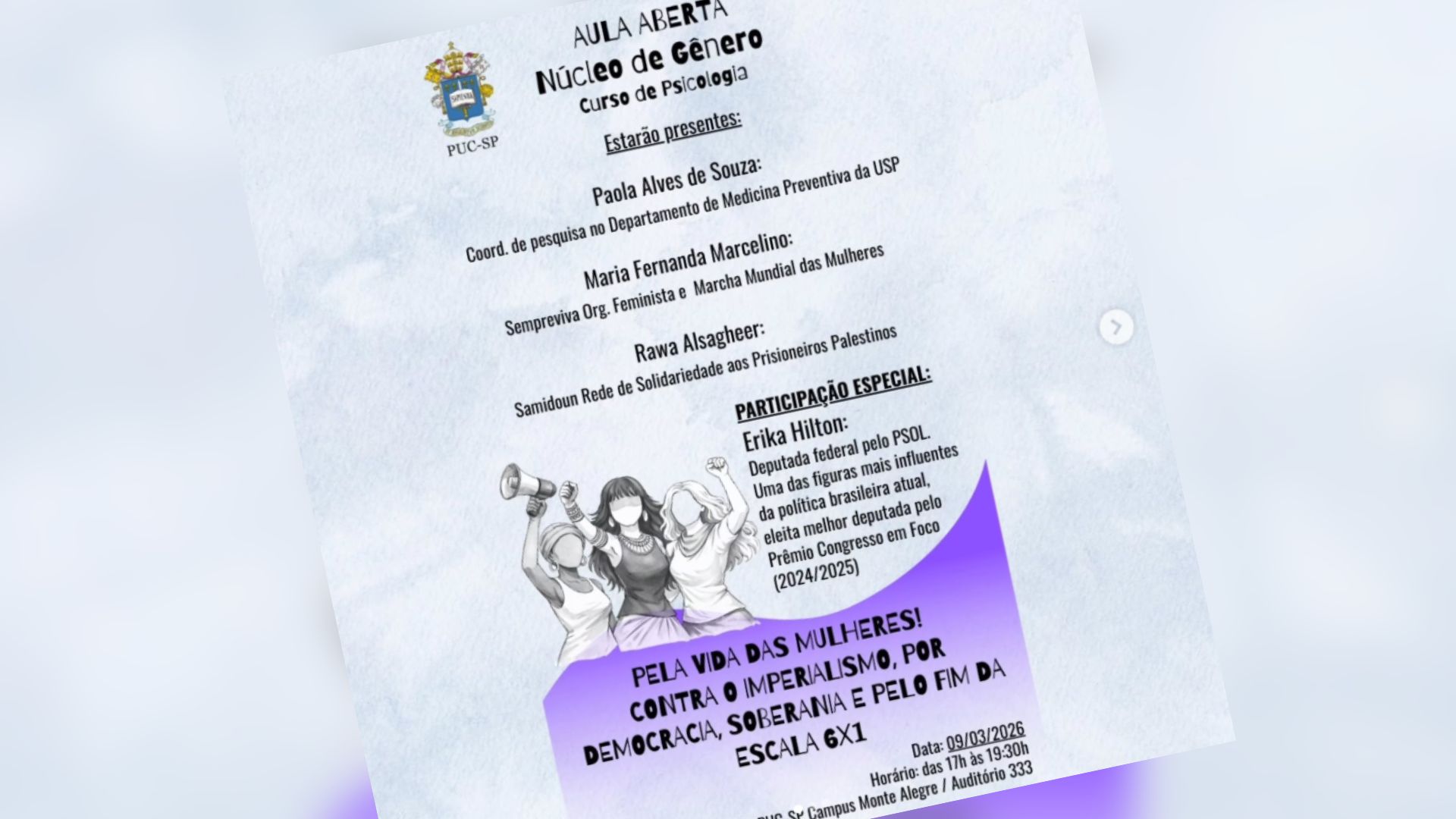 Além de Rawa Alsagheer e Erika Hilton — responsável pela PEC pelo fim da escala 6×1 — o evento contou com a participação de outras personalidades. Estiveram presentes a professora Myrt Cruz, da PUC-SP; Maria Fernanda Marcelino, militante da Marcha Mundial das Mulheres e integrante da Sempreviva Organização Feminista; e Paola Alves de Souza, doutora em psicologia pela USP.
